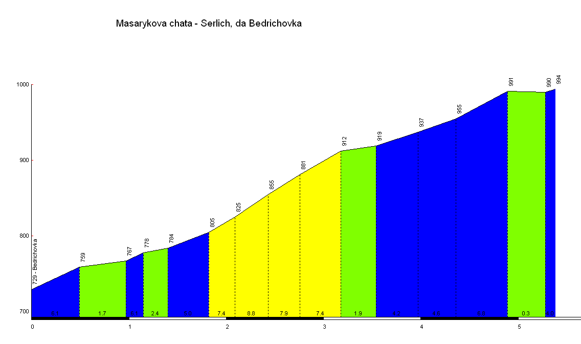 Příloha P 1: Výškový profil se stoupáními na posledních 5 km závodu Orlické Záhoří – Šerlich sedlo od zatáčky s chatou Bedřichovka do cíle. Číslovky nad osou x představují sklon silnice (max. 8,8 %, tzn. na 100 m délky převýšení 8,8 m, což už je v cyklistickém žargonu ´zeď´).