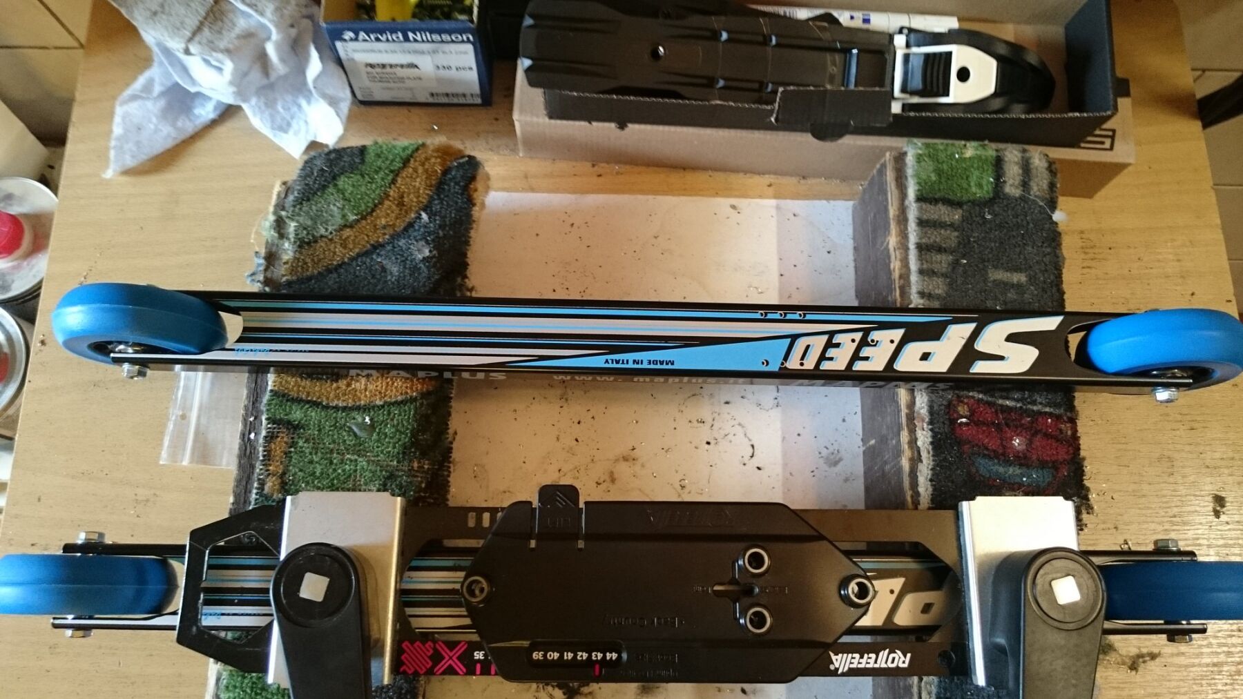 Na první pohled jednoduchá otázka, co? Jasně, namontuji to přece stejně jako běžky, tedy do těžiště či kousek za něj. No jo, jenže tak jednoduché to zase není, pokud totiž nemáte úplně malinkou nohu, tak se vám vázání nepodaří dát do těžiště. Zkrátka, v oblasti mezi těžištěm a koncem lyže, není dostatek prostoru pro větší botu. Nezbývá tedy než vázání namontovat více dopředu, tedy před těžiště. To však má za následek to, že při jízdě (při zvednutí lyže od asfaltu) vám bude zadní kolečko/konec lyže padat dolů, zatímco špička se bude zvedat nahoru. Budete tím pádem nuceni zvedat nohy výše, než je technicky správné. Lze to připodobnit k jízdě v hlubším sněhu, kde je lyžař taktéž nucen zvedat nohy výše než na precizně upravené trati.